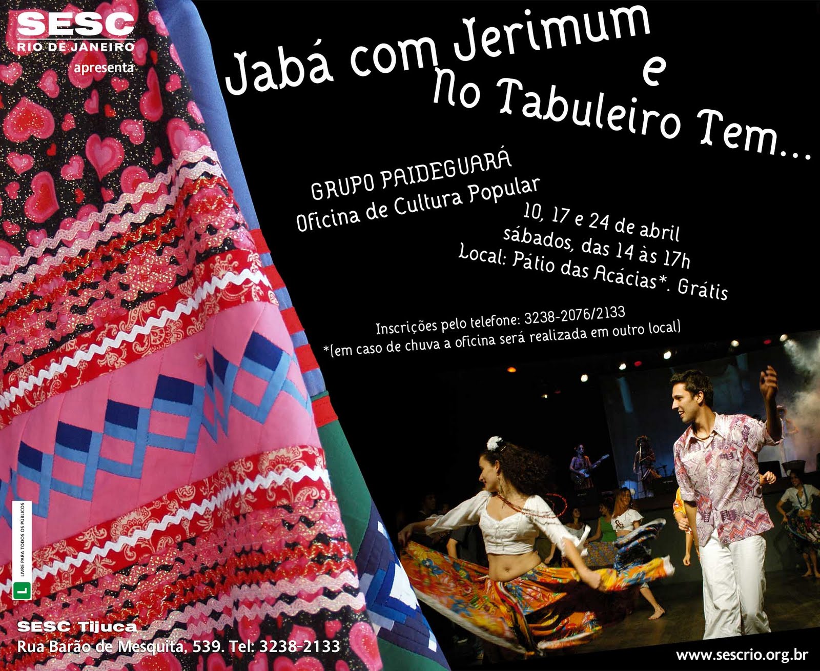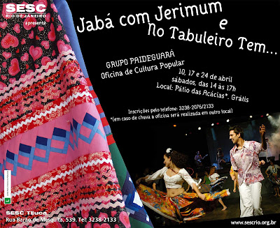 Dando continuidade ao Projeto Danças Brasileiras, onde o Sesc Madureira mensalmente recebe grupos de Cultura Popular para desenvolver atividades na Unidade, no mês de junho, é a vez do grupo Paideguará, que focalizará oficinas de Carimbó e Siriá. No segundo e terceiro sábado do mês acontecem as oficinas, e no último sábado o grupo, junto com os participantes da oficina, demonstra seu processo junto ao público. Todos estao Convidados...